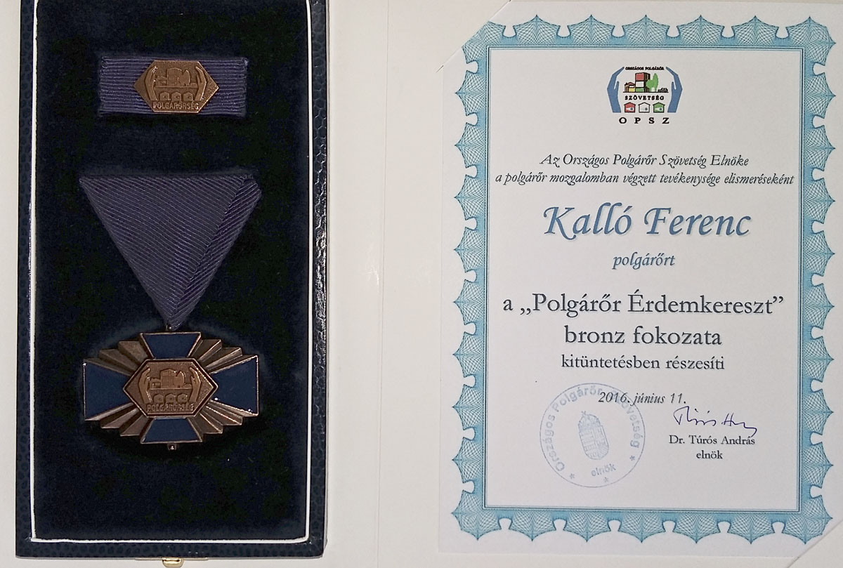 Gratulálunk Kalló Ferenc szakmai vezetőnek, akit a 2016. június 11-én megtartott Pest Megyei Polgárőrszövetség közgyűlésén az OPSZ elnöke, Dr. Túrós András a „ Polgárőr Érdemkereszt” bronz fokozata kitüntetésben részesített a polgárőr mozgalomban végzett tevékenysége elismeréseként!