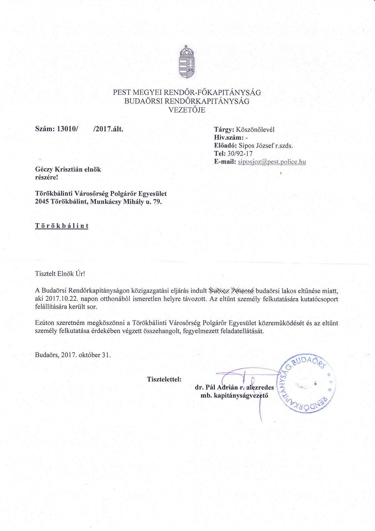 Gratulálunk a Törökbálinti Városőrség polgárőrének! Köszönet a Törökbálinti Rendőrőrs járőreinek a gyors intézkedésekért.
