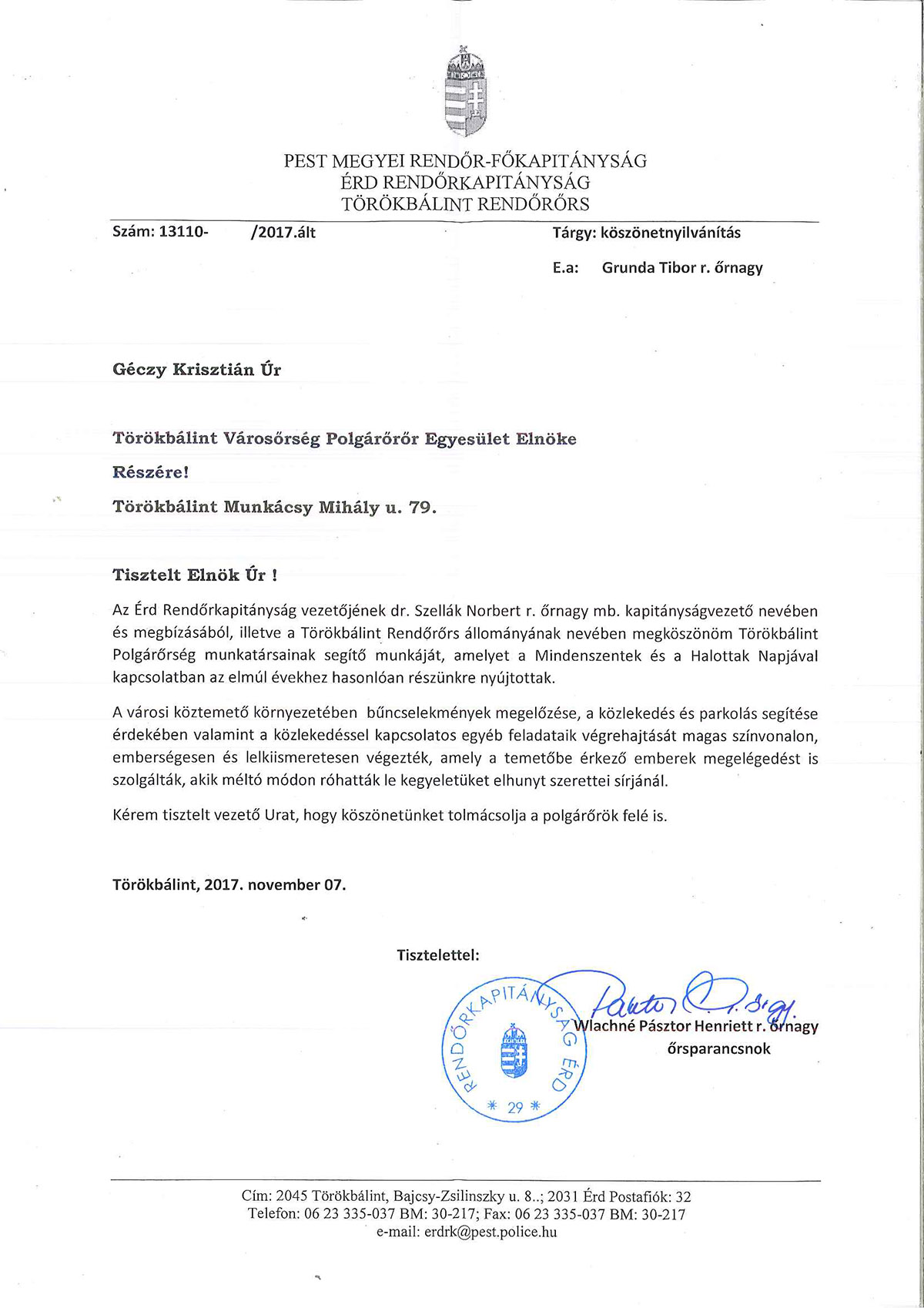 Tájékoztatlak, hogy a Törökbálinti Városőrség Polgárőr Egyesület éves rendes közgyűlését 2017. május 10. napjára, 18:00 órai kezdettel a Munkácsy Mihály Művelődési Ház, Festetics / házasságkötő / termébe összehívom.