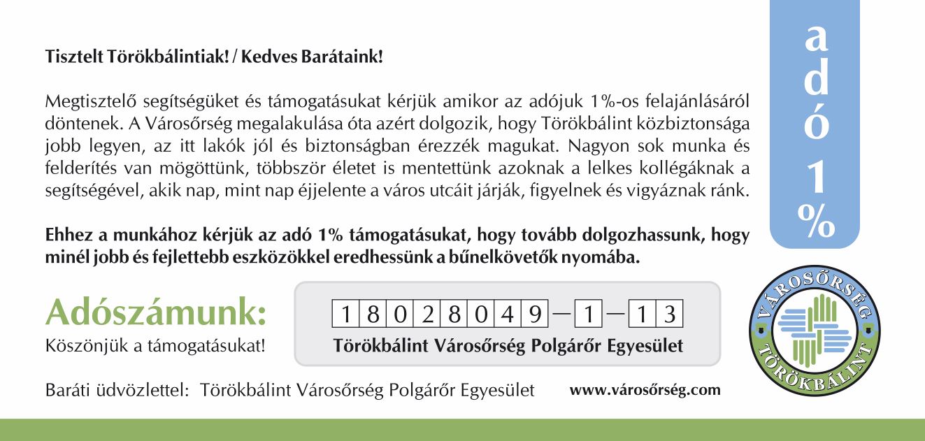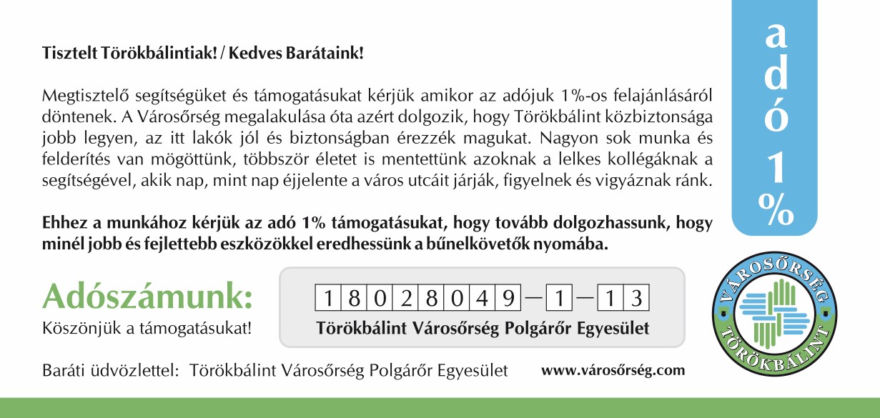Megtisztelő segítségüket és támogatásukat kérjük amikor az adójuk 1%-os felajánlásáról döntenek. A Városőrség megalakulása óta azért dolgozik, hogy Törökbálint közbiztonsága jobb legyen, az itt lakók jól és biztonságban érezzék magukat. Nagyon sok munka és felderítés van mögöttünk, többször életet is mentettünk azoknak a lelkes kollégáknak a segítségével, akik nap, mint nap éjjelente a város utcáit járják, figyelnek és vigyáznak ránk.